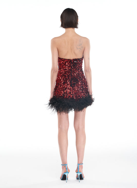 TAGLIONI Sequin Feathers strapless Dress in Red